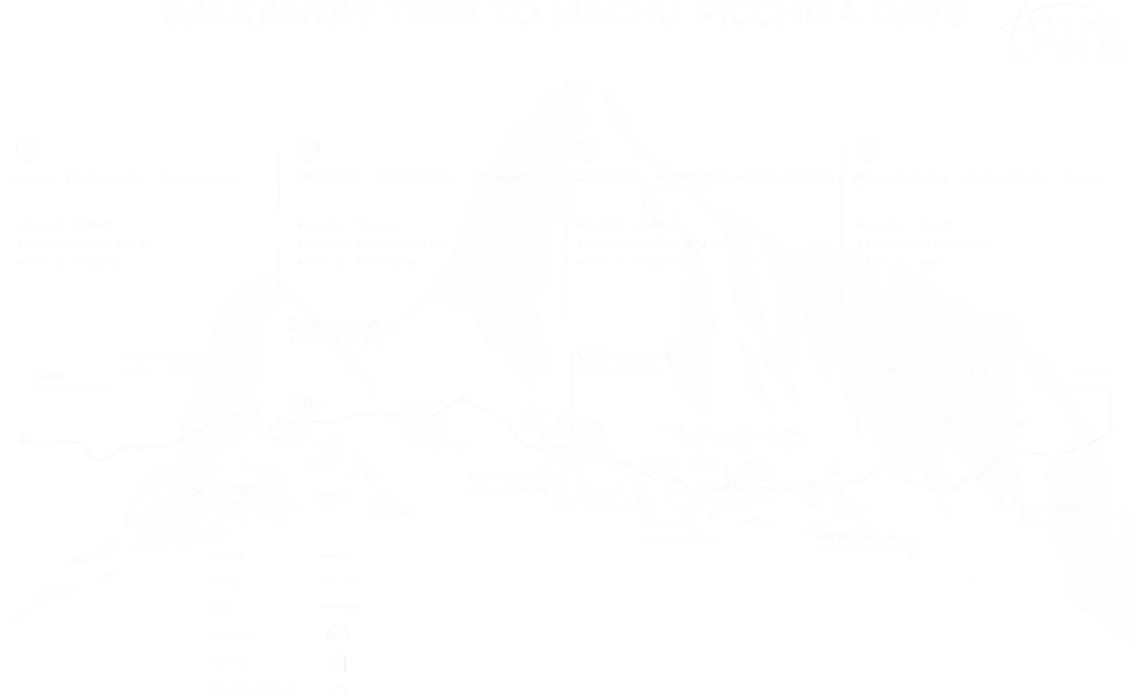 During the journey, you will reach the highest point at the Salkantay Pass, over 4,600 metres above sea level, where you will enjoy spectacular views of the Andes. The trail then continues into the cloud forest, passing through local communities, coffee plantations, and less crowded routes, allowing for a more authentic connection with nature and Andean culture.
