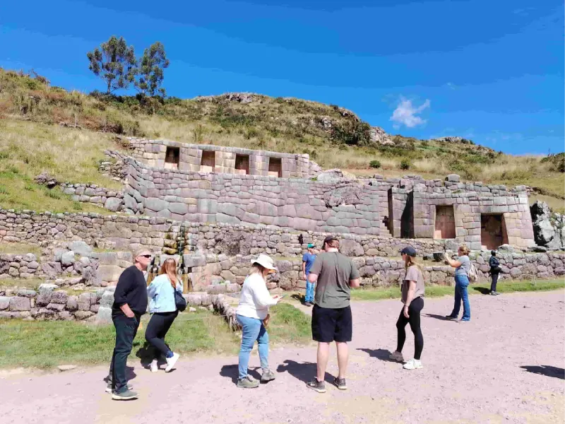 El recorrido continúa hacia el centro arqueológico de Qenqo, un importante sitio ceremonial donde se realizaban rituales religiosos. En este lugar se pueden observar pasajes tallados en roca, altares ceremoniales y canales que probablemente fueron utilizados en ceremonias vinculadas a la cosmovisión andina.